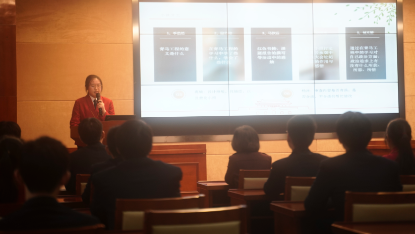 紧接着来自第五组的张孜旖同学和大家一起回顾了这一年来的点点滴滴。在最后,她说道:“通过本次培训,使我们对于马克思理论等有了更深层次的认识,使每位团员都对自我的职务与使命有了更深层次的认识。通过这一段时间,是对我们团员对于自我提升的一个转变。参加过本次活动后,我认识到我们在享有自我权力的同时,应该努力学习马克思列宁主义,宣传执行党的基本路线和各项方针政策,发挥社会主义新风尚,提倡共产主义道德。为实现共产主义而不断奋斗。在学校生活中,作为青马工程的一份子,我们更需要具有刻苦学习的精神和勤奋工作的态度,更要具有严于律己的态度。”