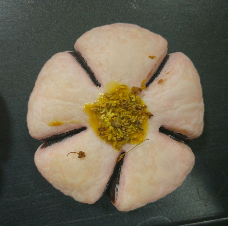4. 包馅烘烤:取面团按压擀圆,包入25g豆沙馅,收口朝下搓圆,用刀在顶部划4-5道十字花刀(不切断),刷一层蛋黄液,点缀黑芝麻。