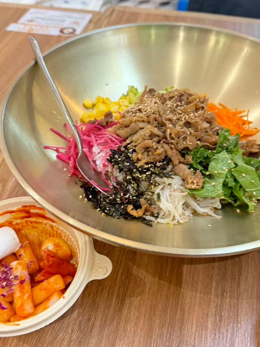 和朋友约了收藏好久的韩式料理店,刚入座就被端上来的肥牛拌饭惊艳到!满满一碗米饭上铺着厚厚一层肥牛,肥瘦相间,淋上灵魂酱汁,撒上芝麻和海苔碎,旁边还卧着一颗溏心蛋,旁边的辣炒年糕裹着红亮的甜辣酱,热气腾腾地冒着香气。我们握着大勺子疯狂搅拌,米饭吸饱了酱汁,和肥牛、蔬菜、溏心蛋充分融合,每一口都能吃到丰富的口感——肥牛的鲜嫩、蔬菜的清爽、米饭的软糯,再配上年糕的Q弹,简直绝了!吃饭时聊着最近的学习和生活,吐槽着小烦恼,分享着小确幸,不知不觉就把一大碗拌饭和年糕扫空。韩式料理的热闹烟火气,加上好友的陪伴,让平淡的日子瞬间变得鲜活起来,原来最幸福的时刻,就是美食在侧,好友在旁。